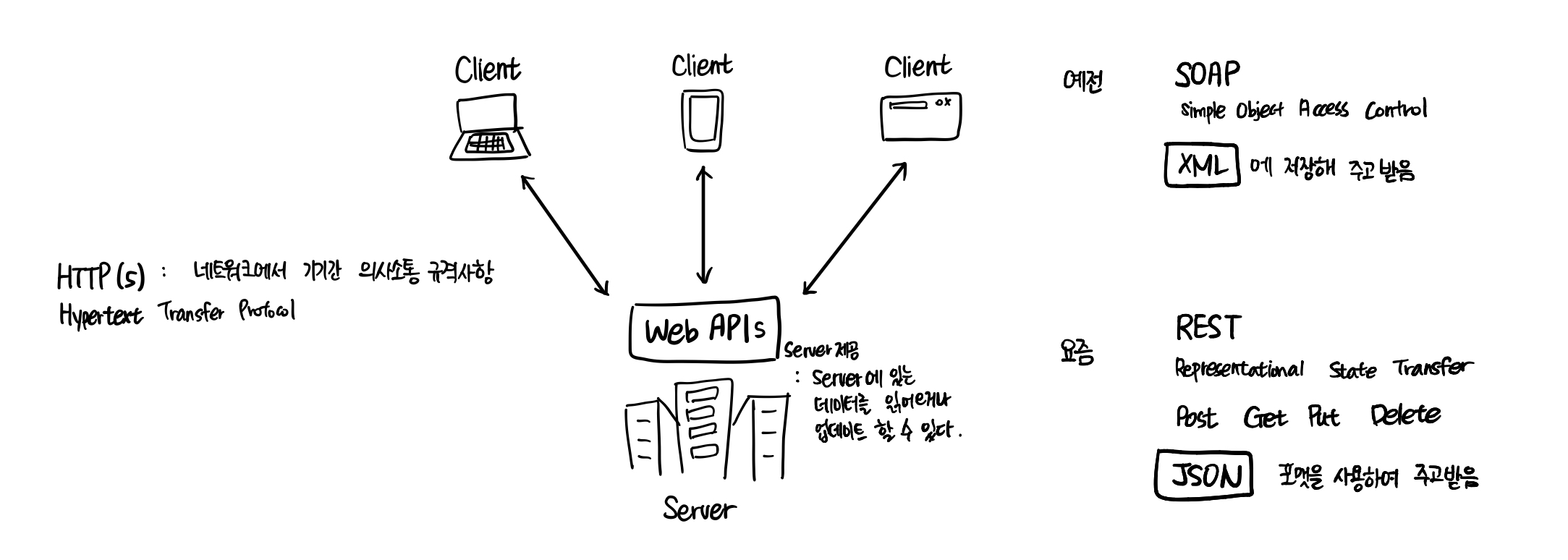 요즘에는 Server에서 제공하는 Web API들을 사용하여 (대부분 REST API) JSON 형식의 정보를 얻어올 수 있습니다.