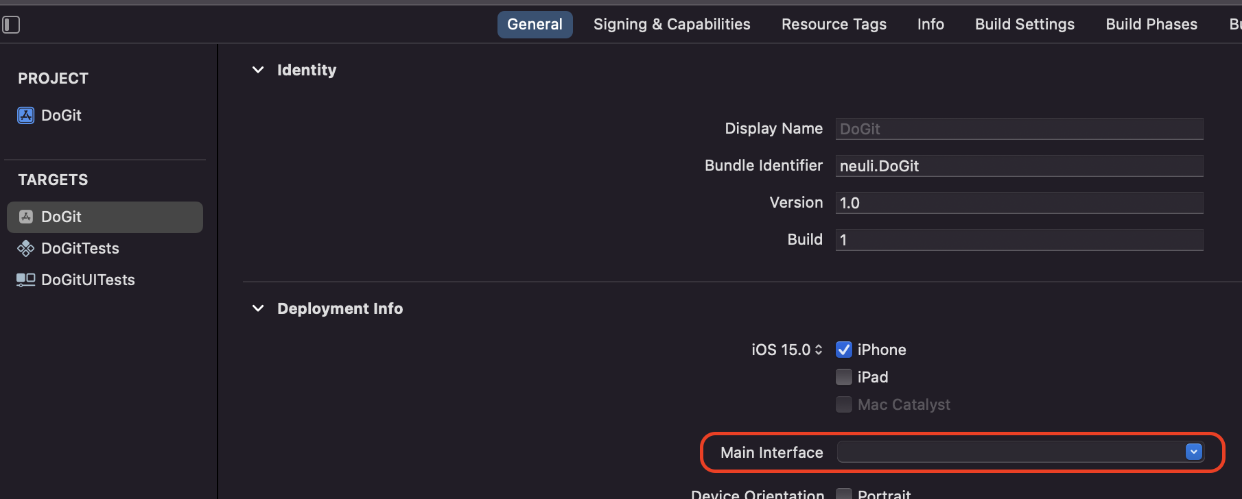 프로젝트 설정의 Tartget (프로젝트) - General - Deployment Info - Main interface 이 Main으로 되어있는지 확인해보자.