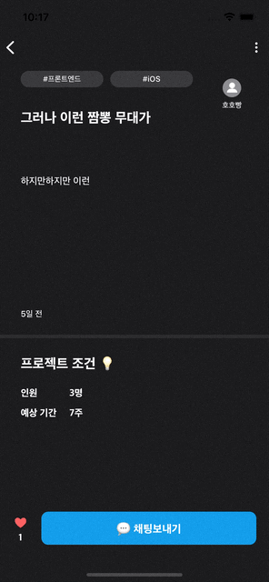 게시글 상세 화면에서 채팅보내기 버튼을 누르면 개인채팅 화면으로 이동하는 기능이 있습니다.
