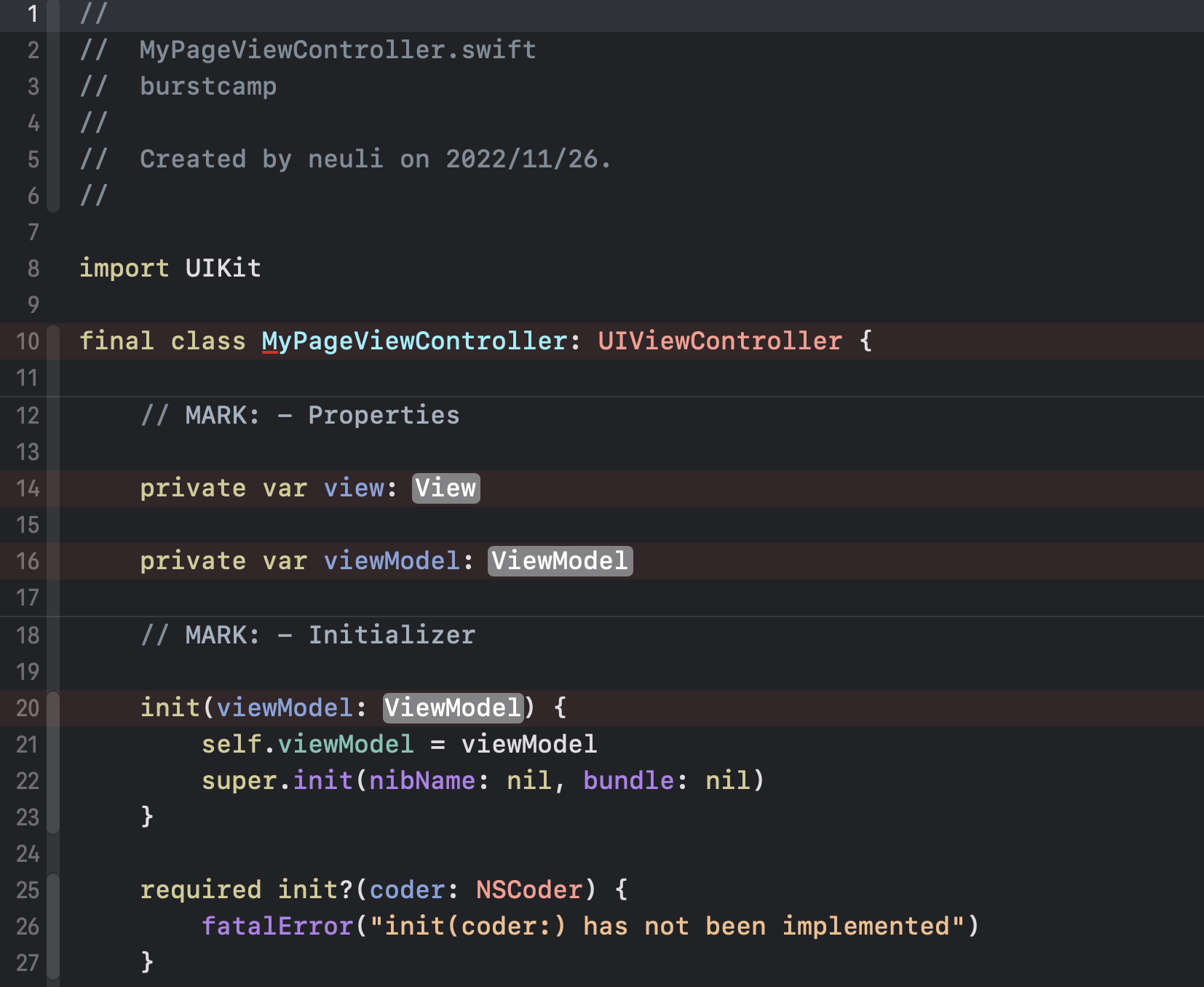 required init, loadView, viewDidLoad, configureUI, bind, MARK 주석