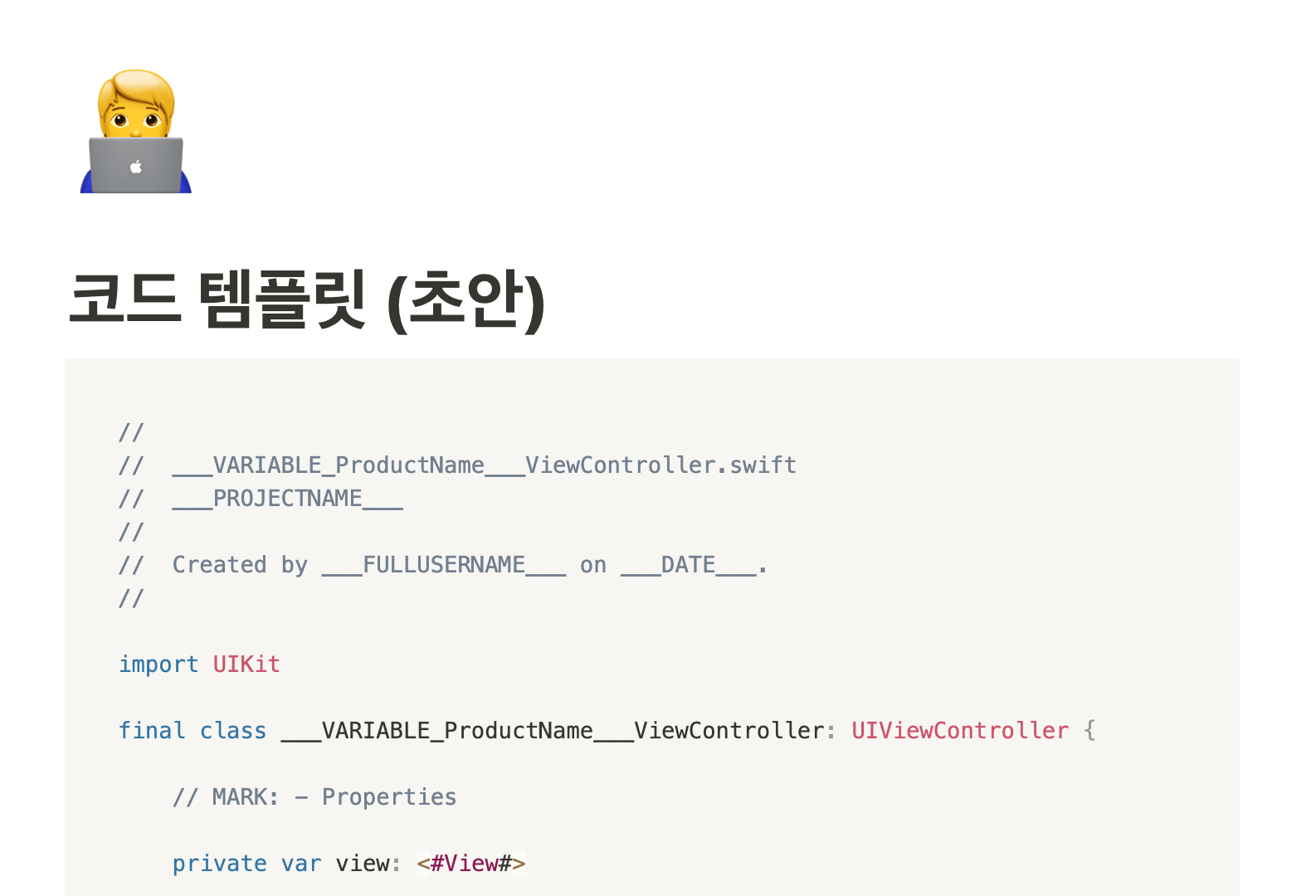 Xcode에서 생성되는 파일입니다. Notion에 적어뒀던 템플릿 내용이 들어가게 됩니다.