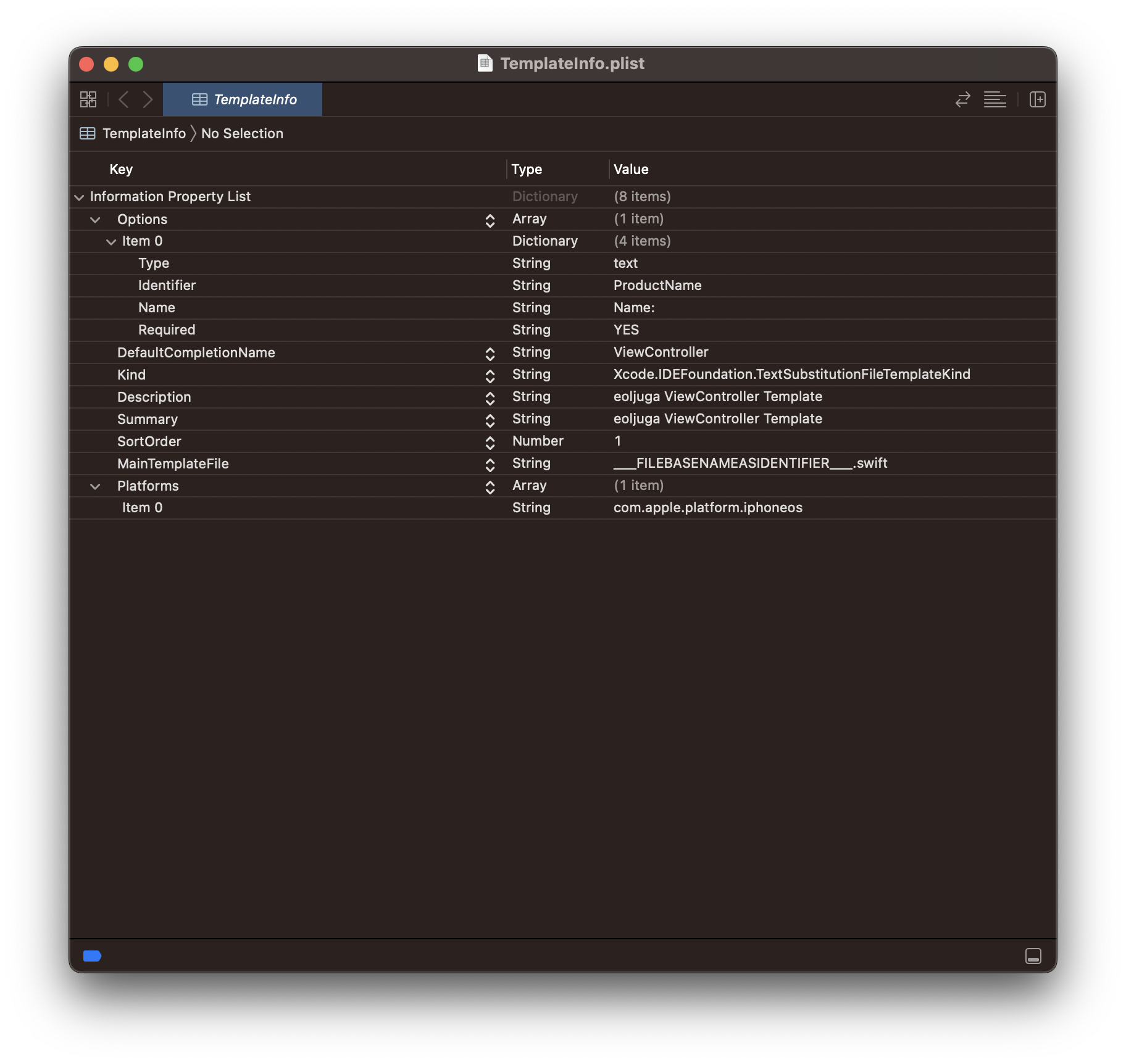 이미 존재하는 xctemplate의 plist 파일을 복사, 변경해서 사용하였습니다.