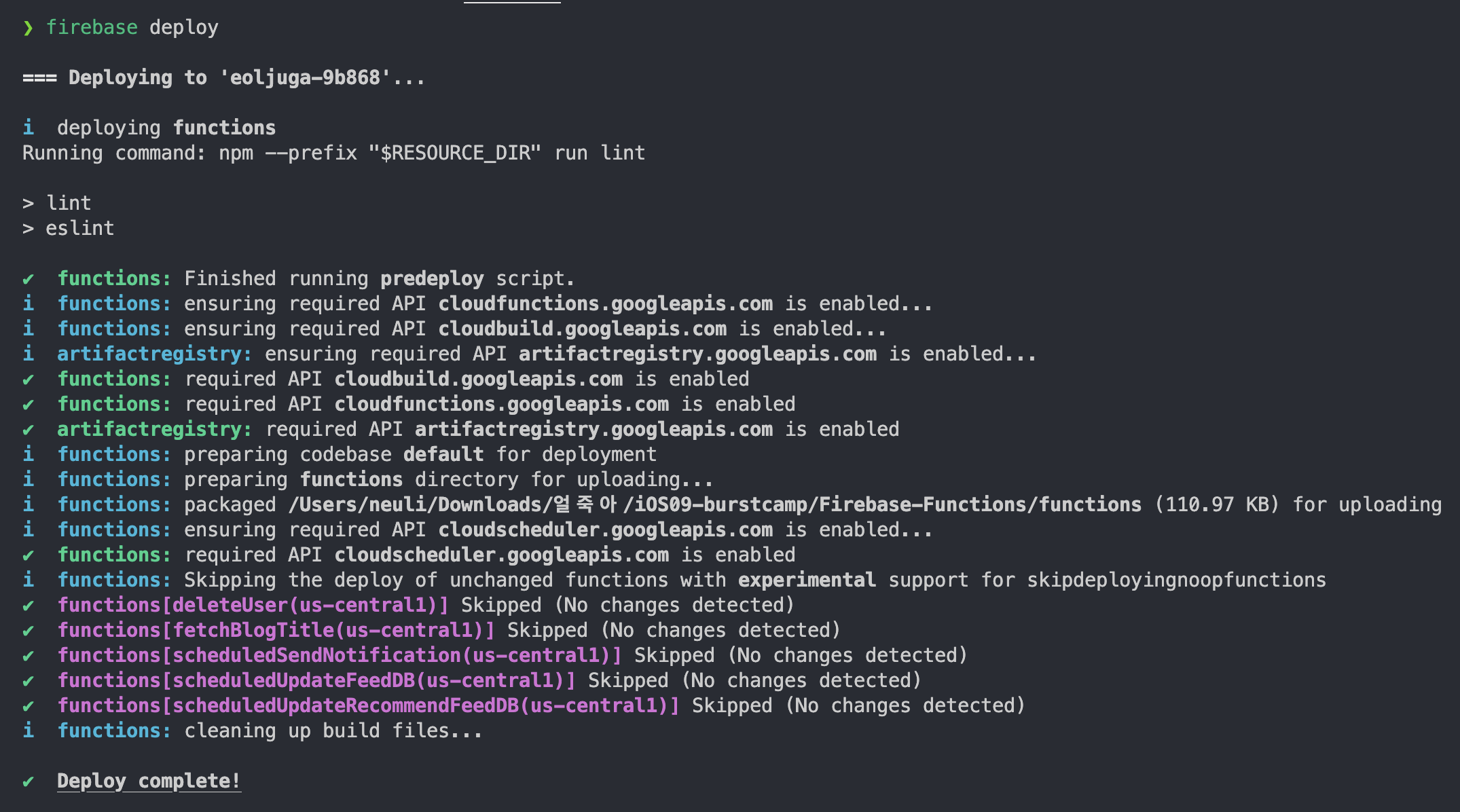 firebase deploy로 index.js에 있는 함수를 배포합니다.