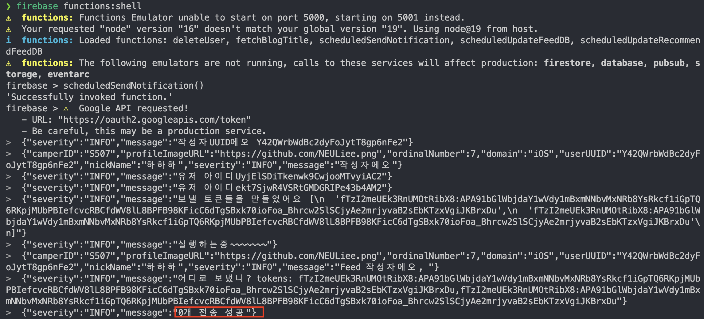 터미널을 열고 function의 shell을 실행하고 export한 scheduledSendNotification() 함수를 호출하면