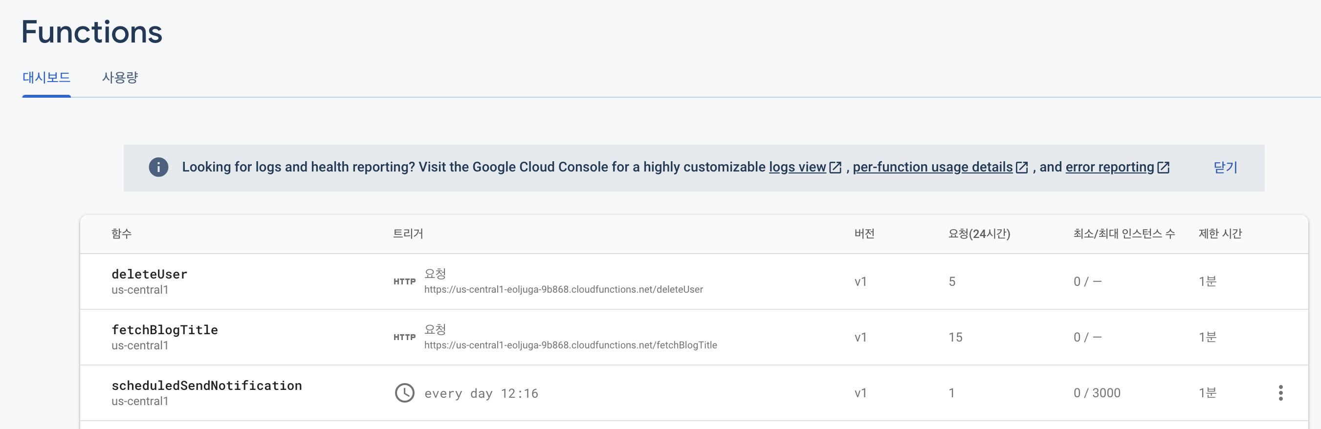 아니면 Firebase Functions 로그 보기를 활용할 수도있습니다.