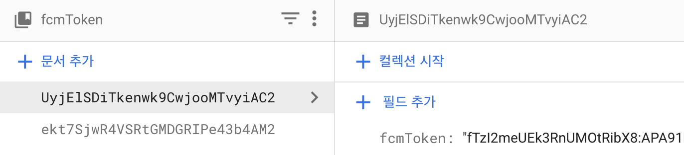 FCM 토큰을 Firebase Functions에서 사용해야 했기 때문에 Firestore에 fcmToken 컬렉션을 만들어 토큰들을 저장하기로 했습니다.