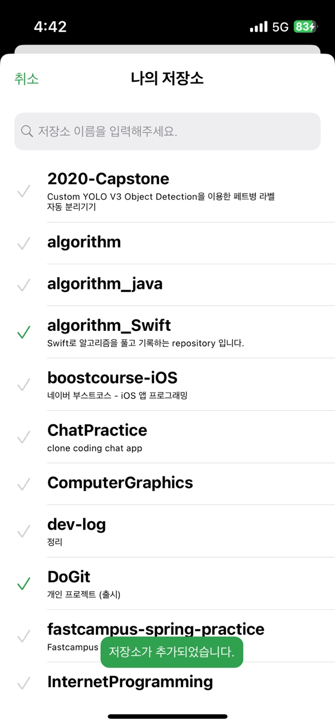 1. 이전에 피드백을 받은 저장소가 추가되었을 때 액션이 부족하다는 피드백을 듣고 추가한 토스트 메세지..