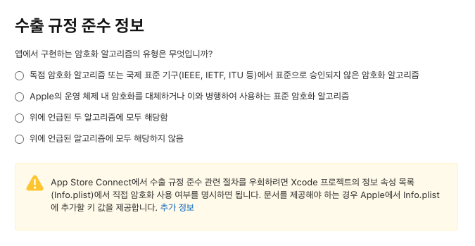 TestFlight 업로드 시 수출규정 관련 문서 누락 메시지 해결하기