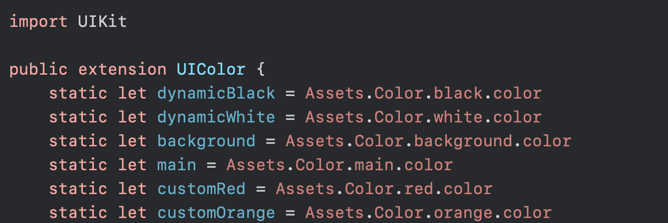 이렇게 추가하고는 SwiftGen 이라는 오픈소스를 사용해서 assets에 있는 컬러들을 자동으로 코드로 변환해주도록 사용했었다.