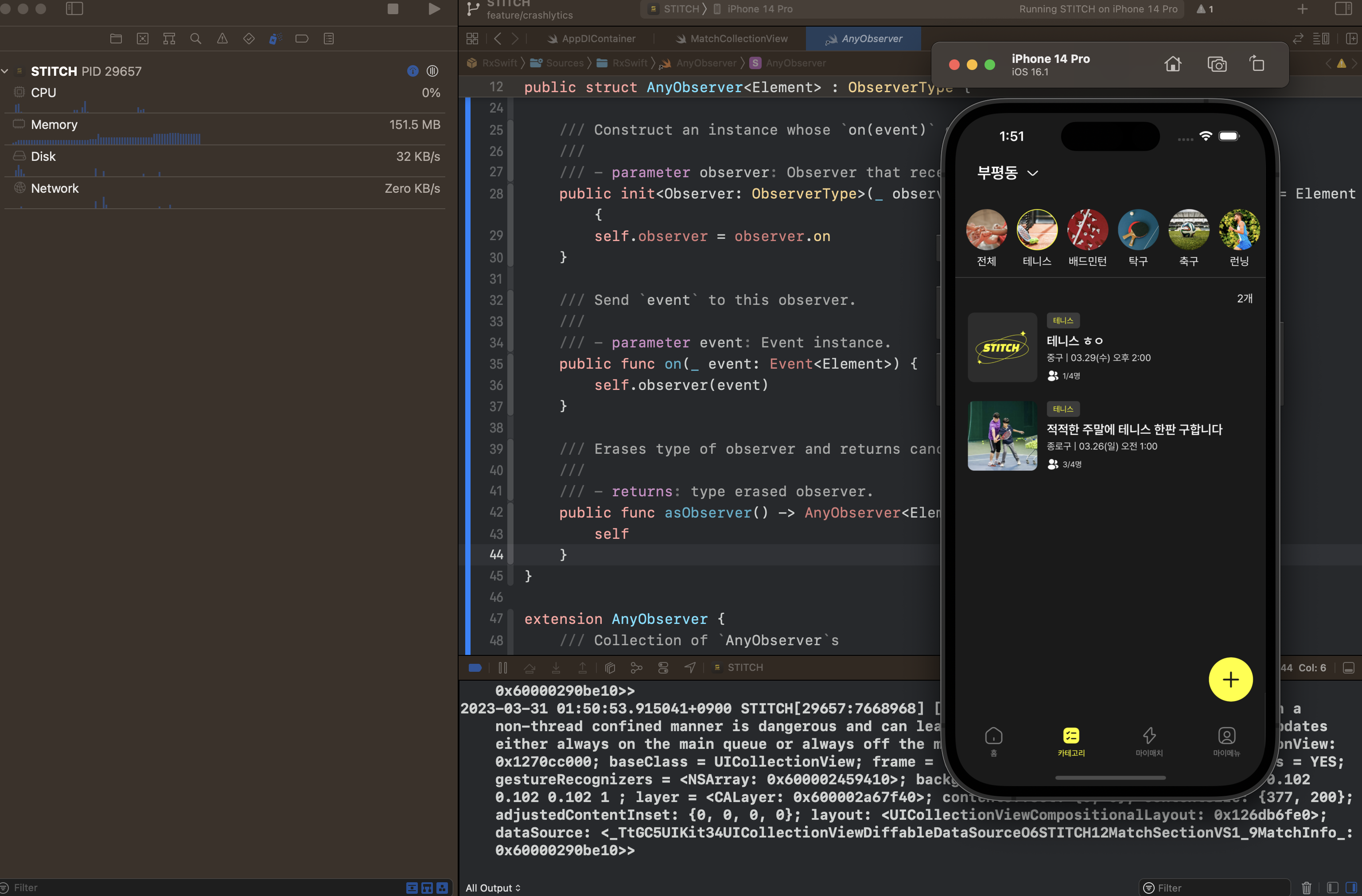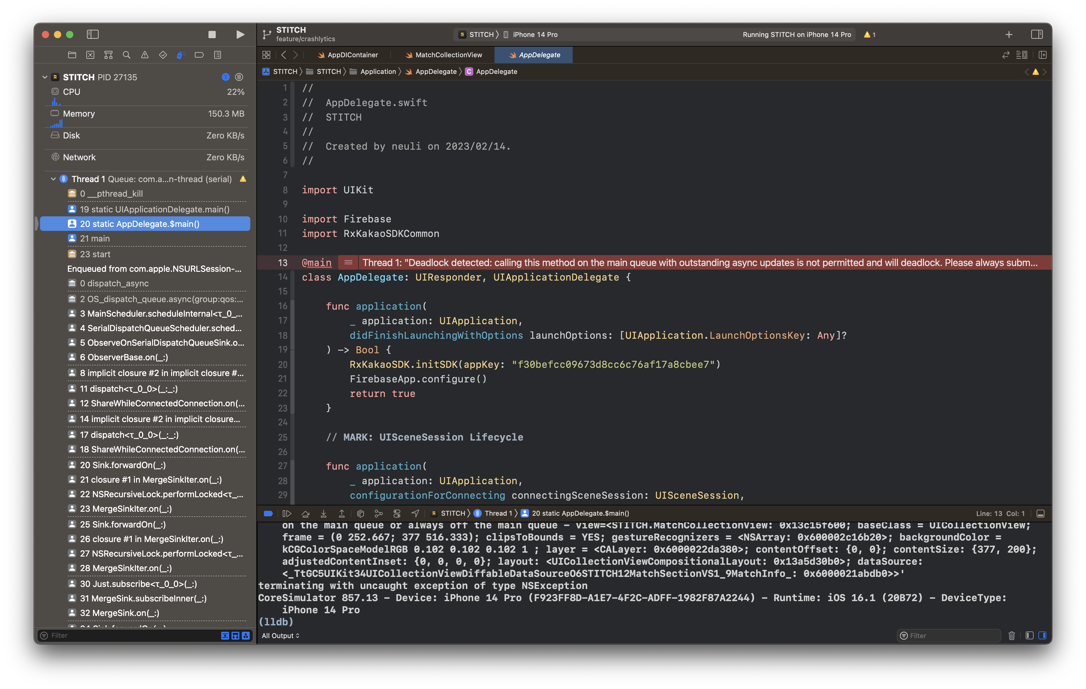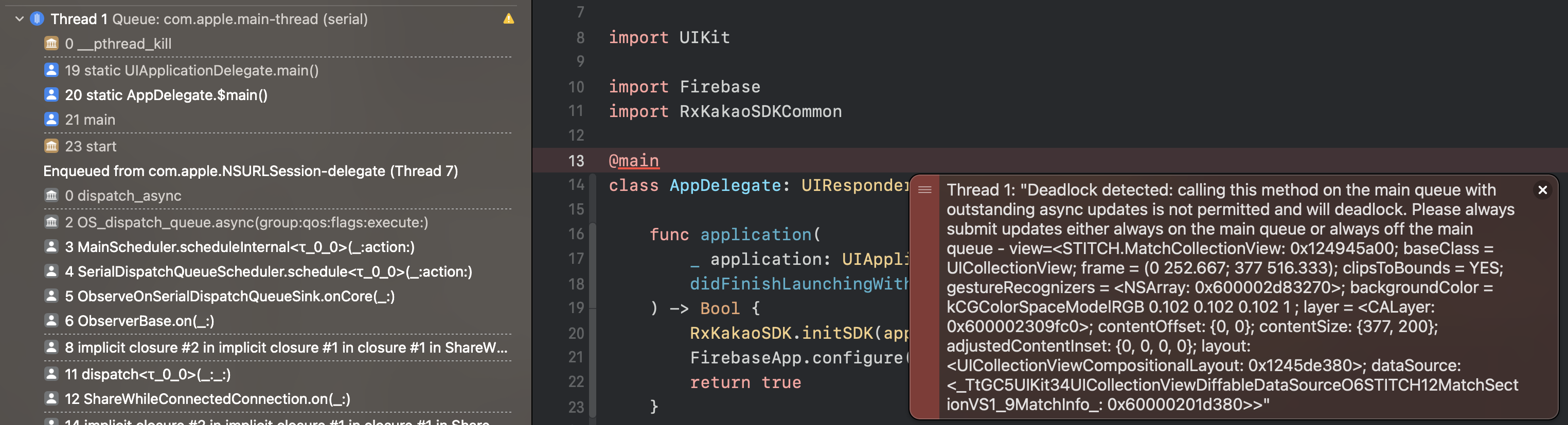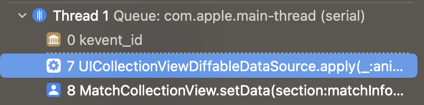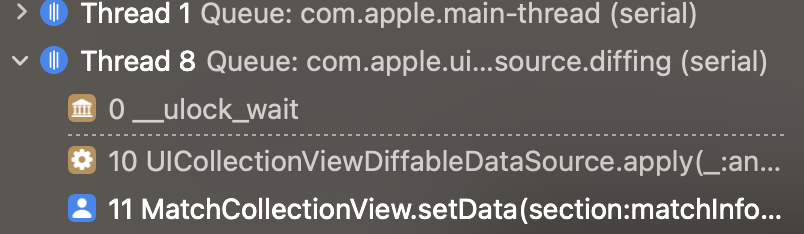 원인이 되는 코드를 찾아 스레드를 거슬러 올라가보니 컬렉션 뷰의 데이터를 업데이트하는 코드를 찾을 수 있었다.