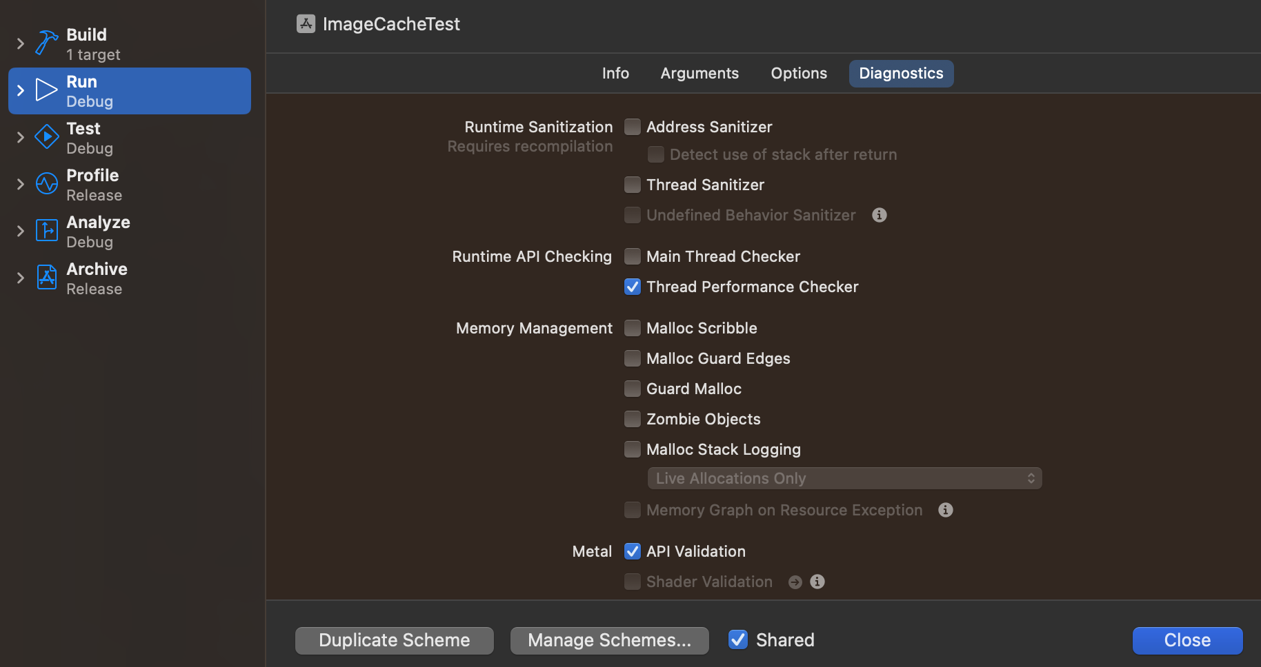 이 체크 표시는 edit scheme 에서 볼 수 있다.