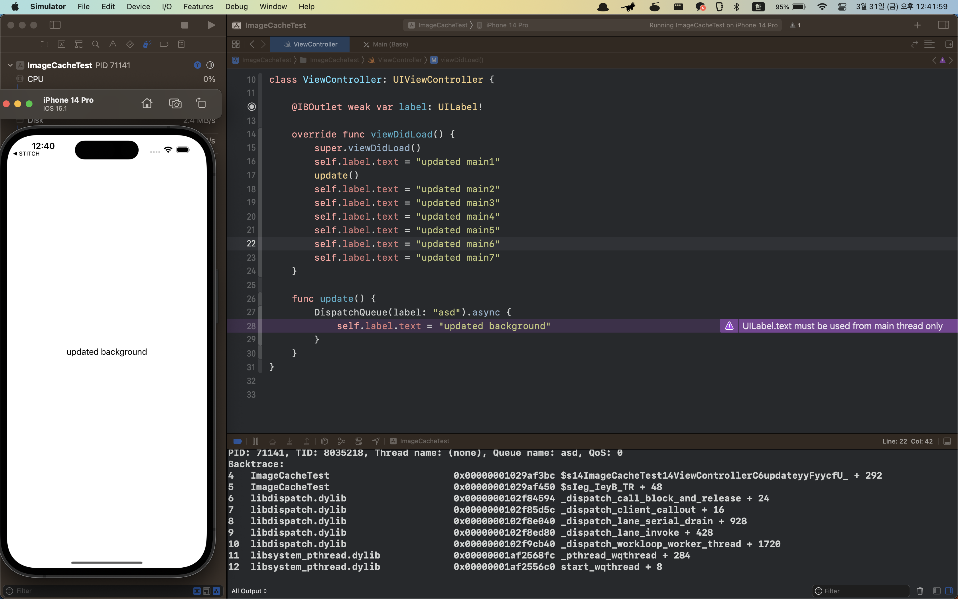 1. 보통은 보라색으로 엑스코드가 백그라운드 스레드의 UI 업데이트를 감지하는데 어떻게 감지하는건지