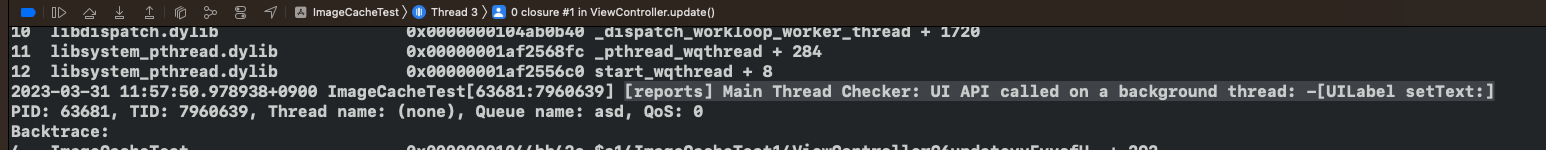 Main Thread Checker 라는 요놈이 UI API가 백그라운드 스레드에서 실행됐다는 것을 감지한 것이였다.