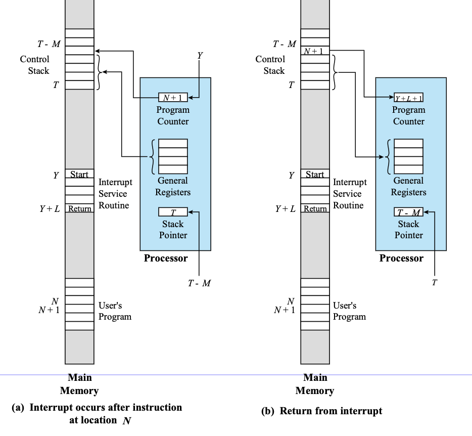 (b) 오른쪽 그림은 인터럽트가 끝나고 난 직후의 (restore 전) 그림이다. 만약 원래 PC 인 N+1를 저장하지 않았다면, ISR의 마지막 Y+L 의 다음인 Y+L+1 이 PC에 들어가 실행됐을 것이다.