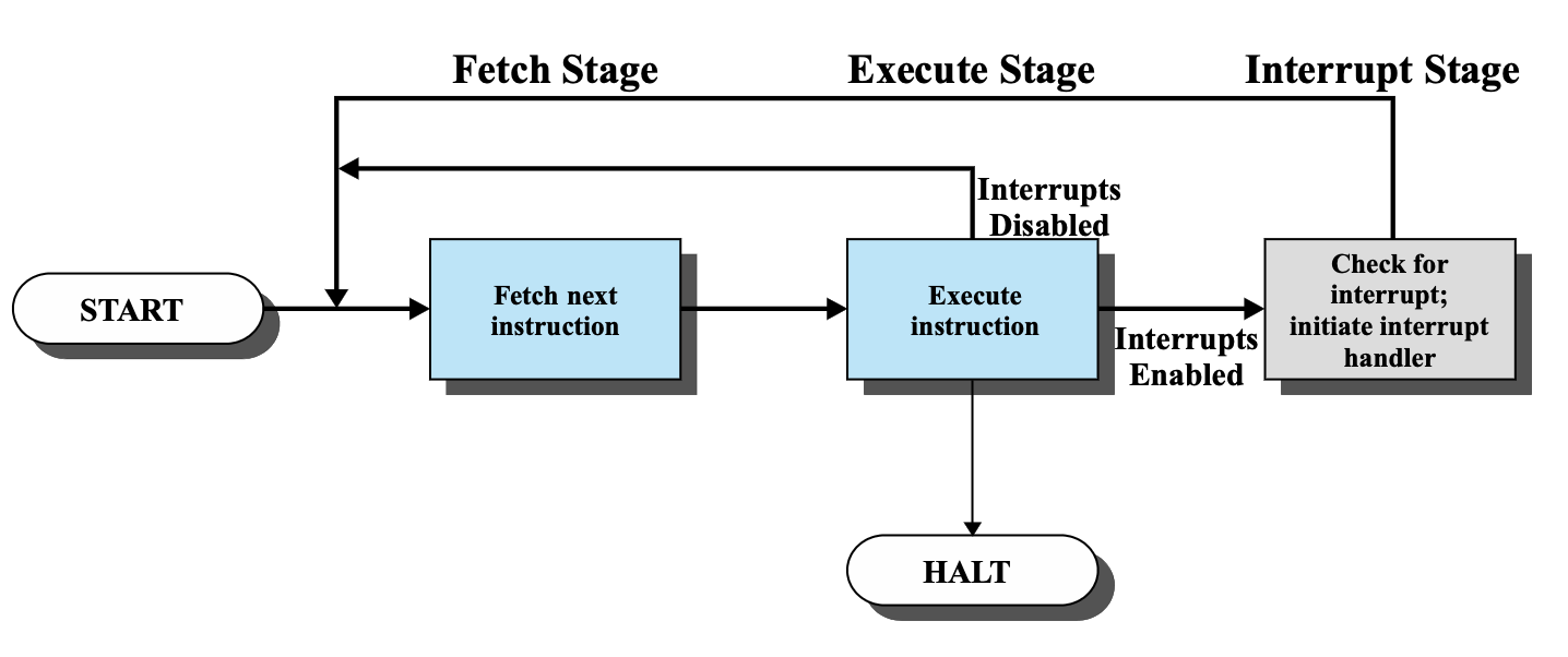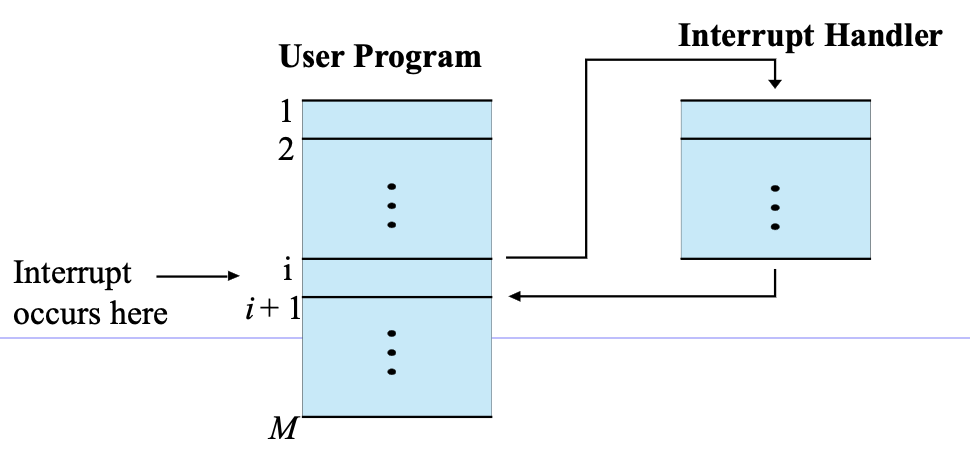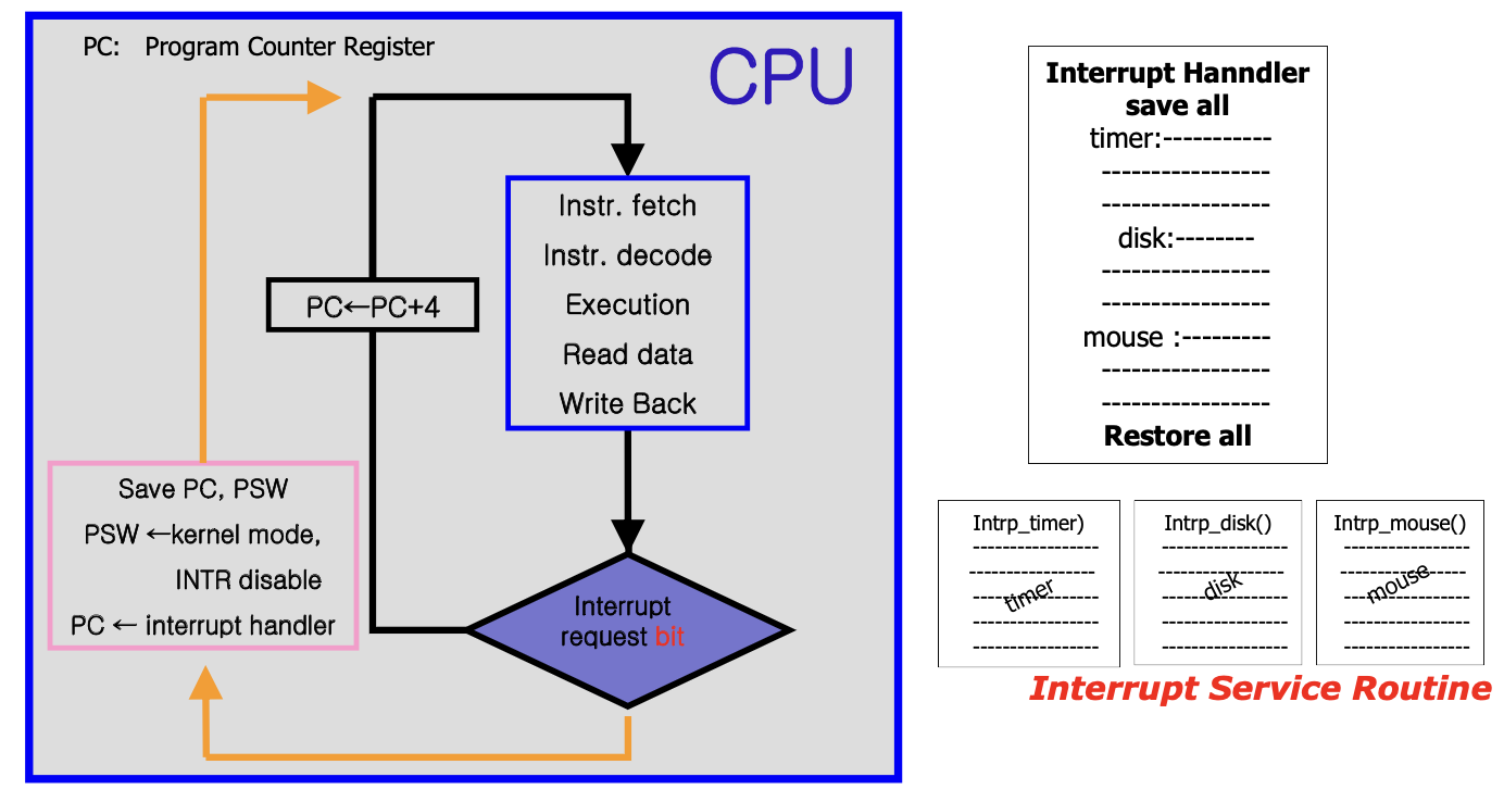 - Interrupts Enabled: 인터럽트가 발생했으면 interrupt handler를 정의해서 인터럽트를 실행한다. 실행 후 원래의 명령어를 실행후에 원래의 프로세스로 돌아간다.