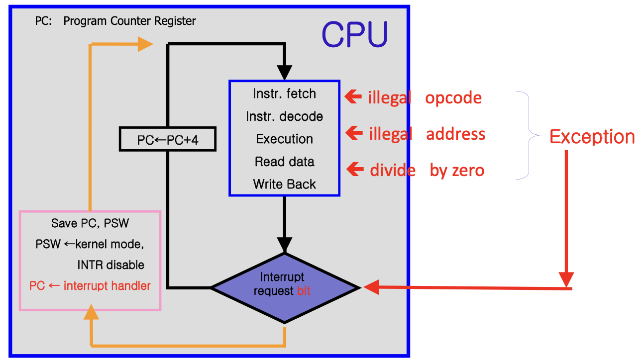 명령어 수행과정 (작은 파란박스) 에서 불법 opcode, 불법 address, divide by zero 등 동기적 인터럽트(익셉션)이 발생하면 인터럽트 리퀘스트 비트를 설정한다.