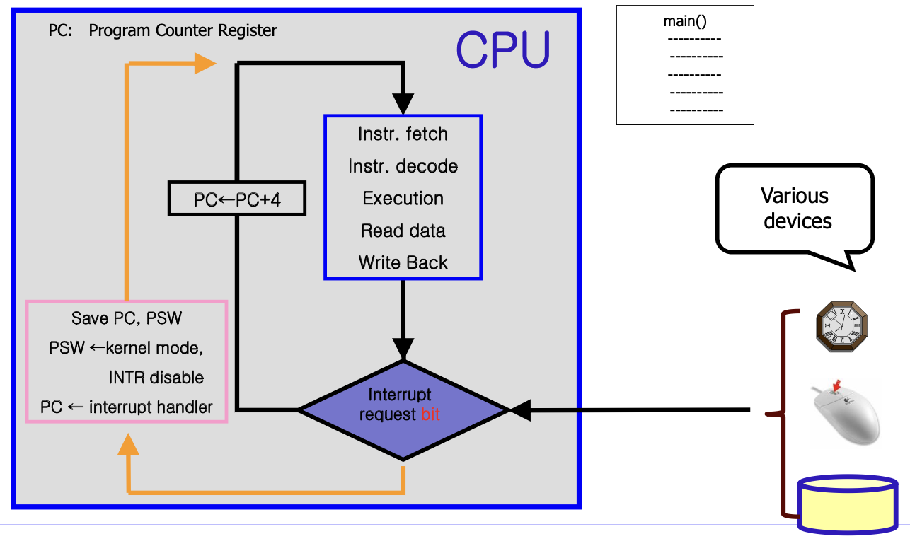 | ex) I/O devices, timer, hardware failure | ex) Program: 비정상적인 조건 - illegal opcode, illegal address, divide by zero |