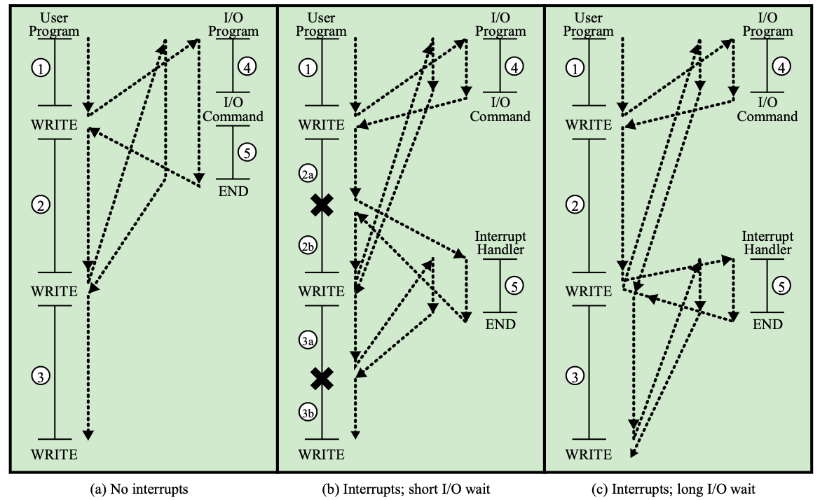 (b) 인터럽트가 발생, 짧은 I/O: 1 - 4 - 2a - 5 - 2b - 4 - 3a - 5 - 3b
