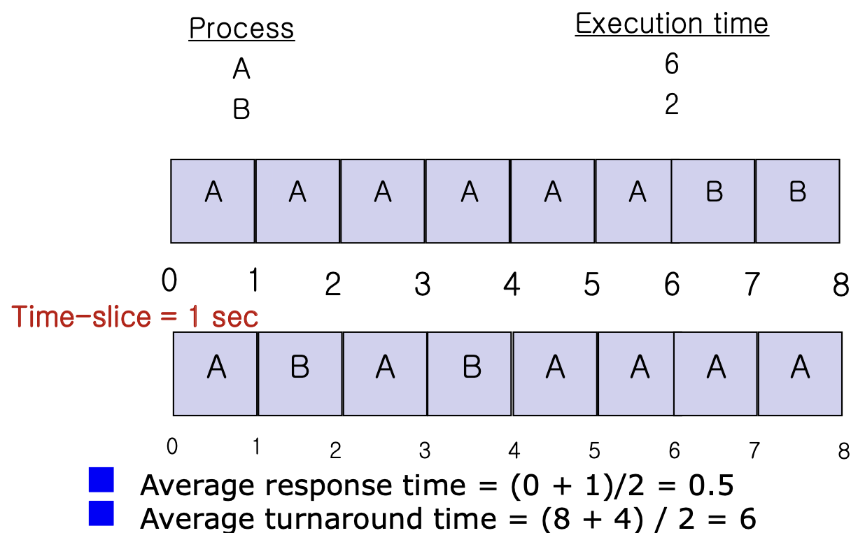 각 job에 Time slice 할당 (preemption 선점) : 시간이 지나면 CPU가 뺏어온다.
